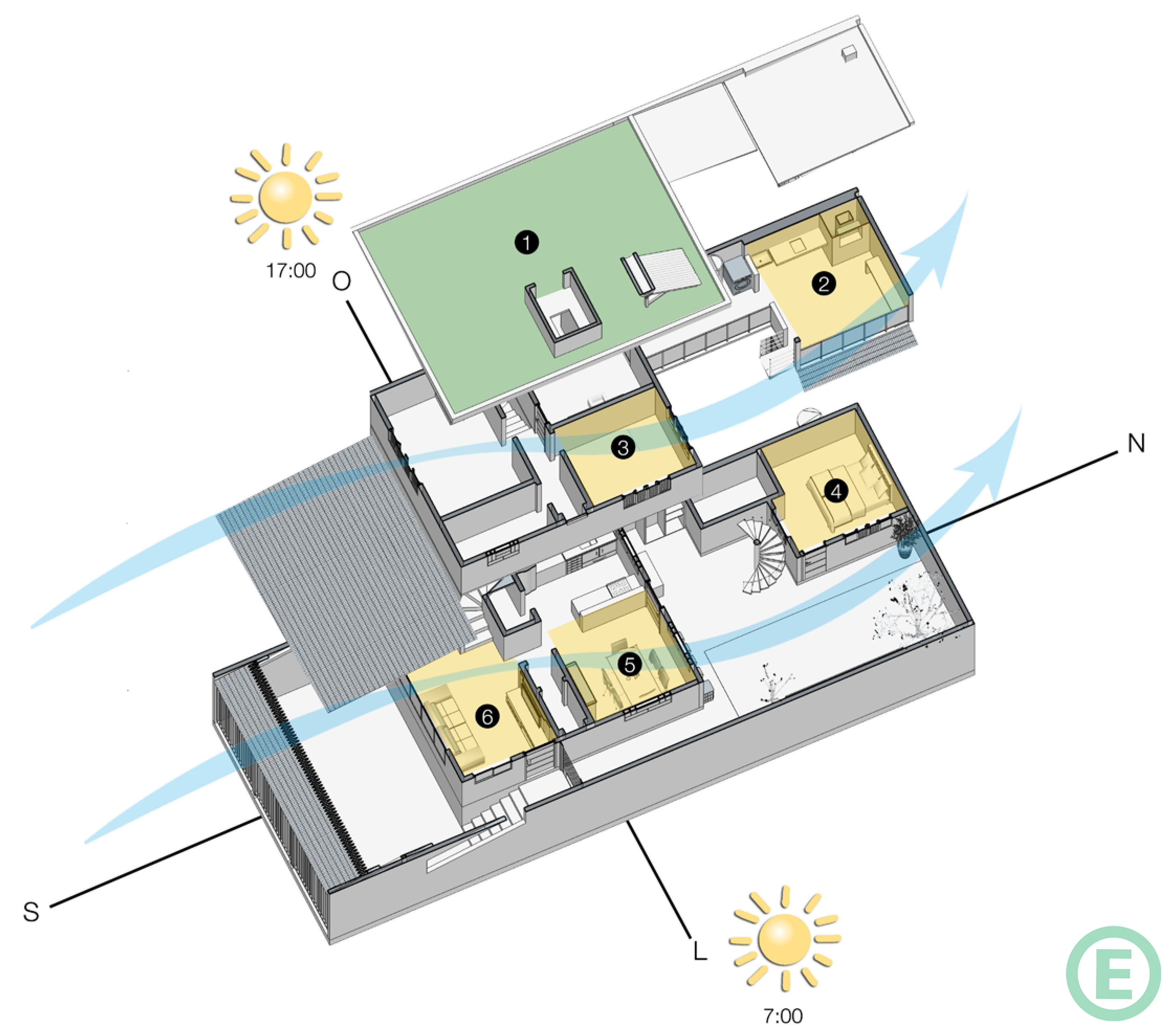 A incidência dos raios solares matinais geram temperaturas agradáveis, higienizando os ambientes voltado a Leste e promovendo saúde. Ambientes iluminados: Churrasqueira (2), Dormitório Luis (3), Suíte Aline (4), Sala de Jantar (5), Sala de Estar (6).