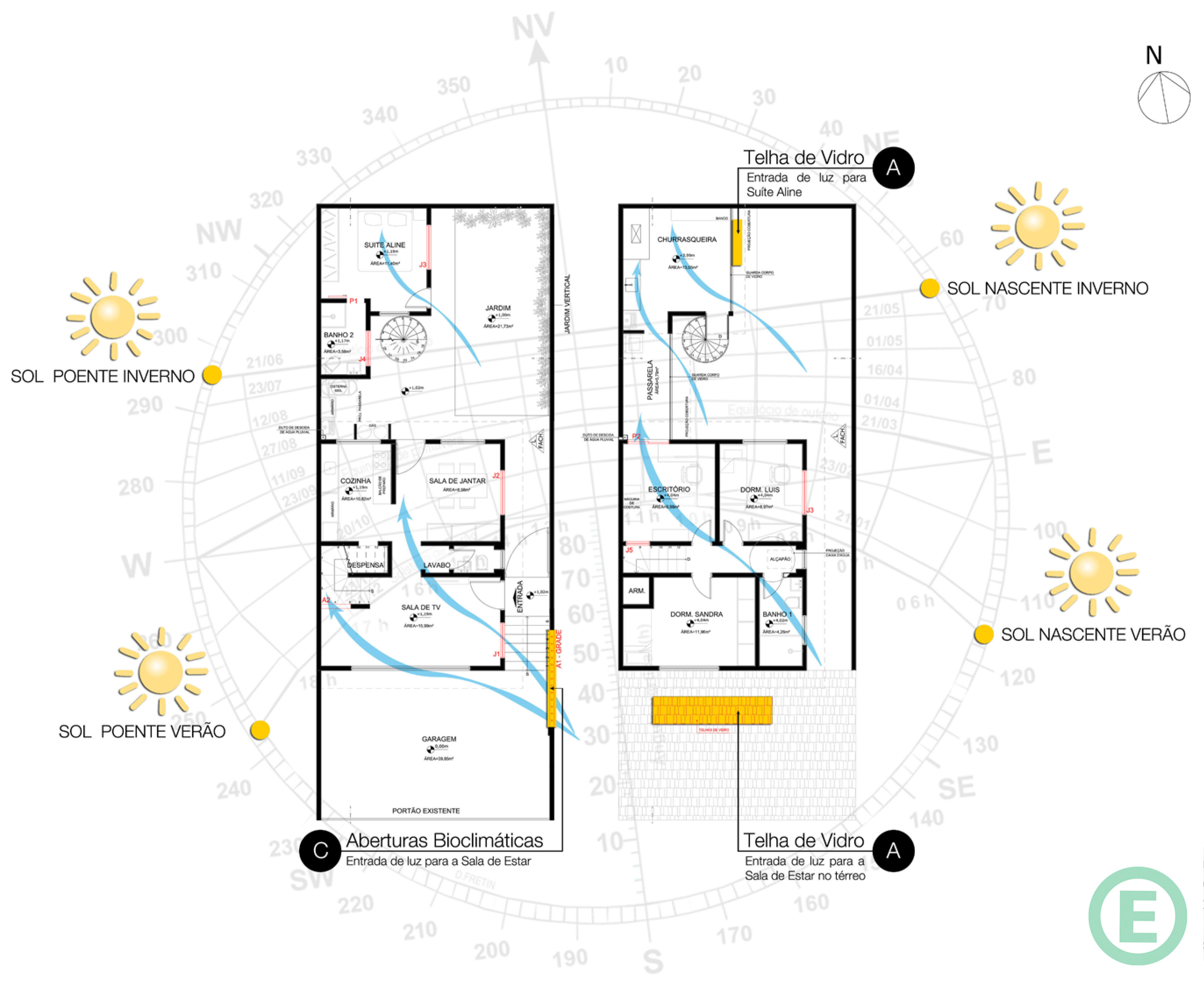 A Bioclimática é a técnica mais importante na hora de projetar uma Residência. Analisamos a direção dos ventos, a trajetória solar e a orientação da edificação de acordo com a localização do projeto.