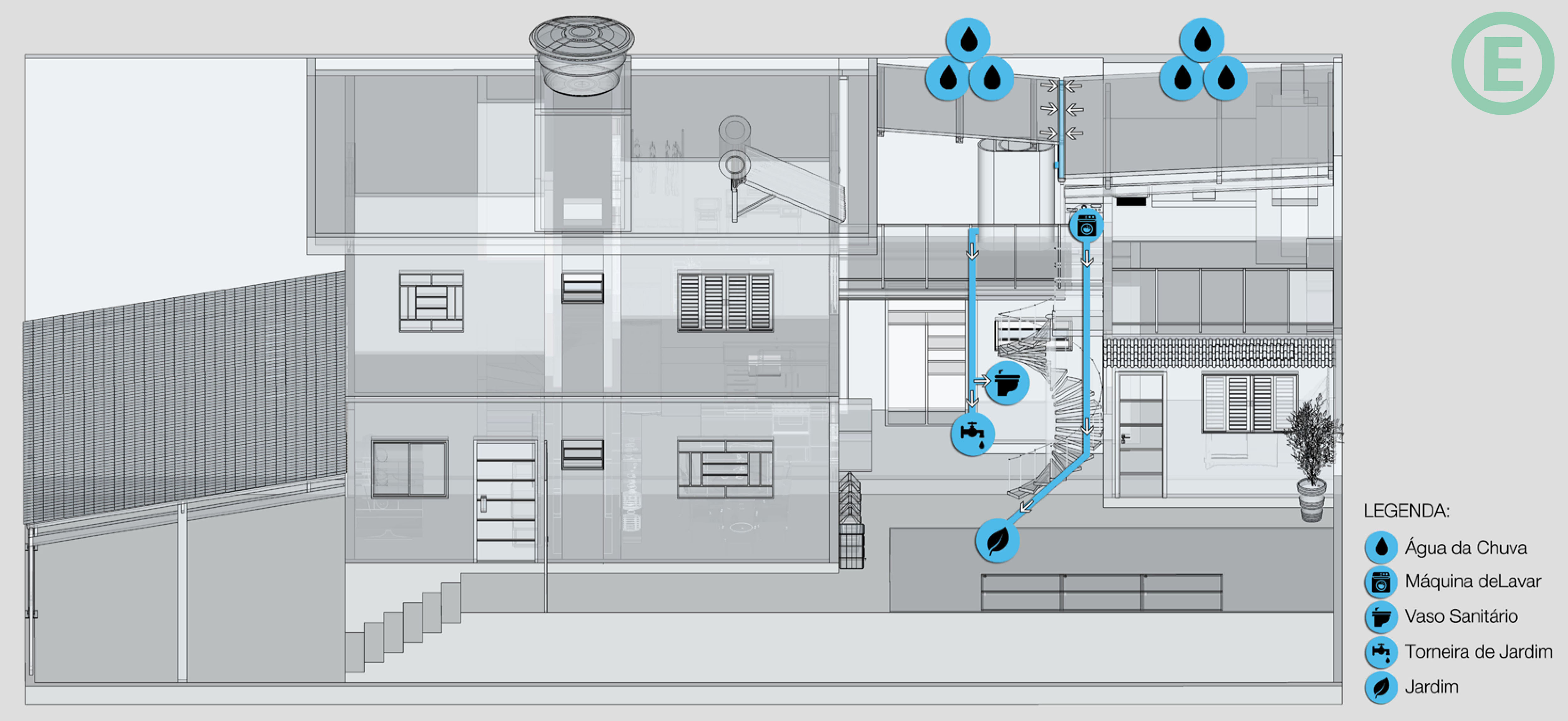 O esquema acima mostra o caminho da água da chuva desde a sua captação até o seu destino. O sistema é baseado nas seguintes etapas: Água da chuva -> Calha -> Tubulação -> Filtro -> Cisterna -> Pontos de Destino
