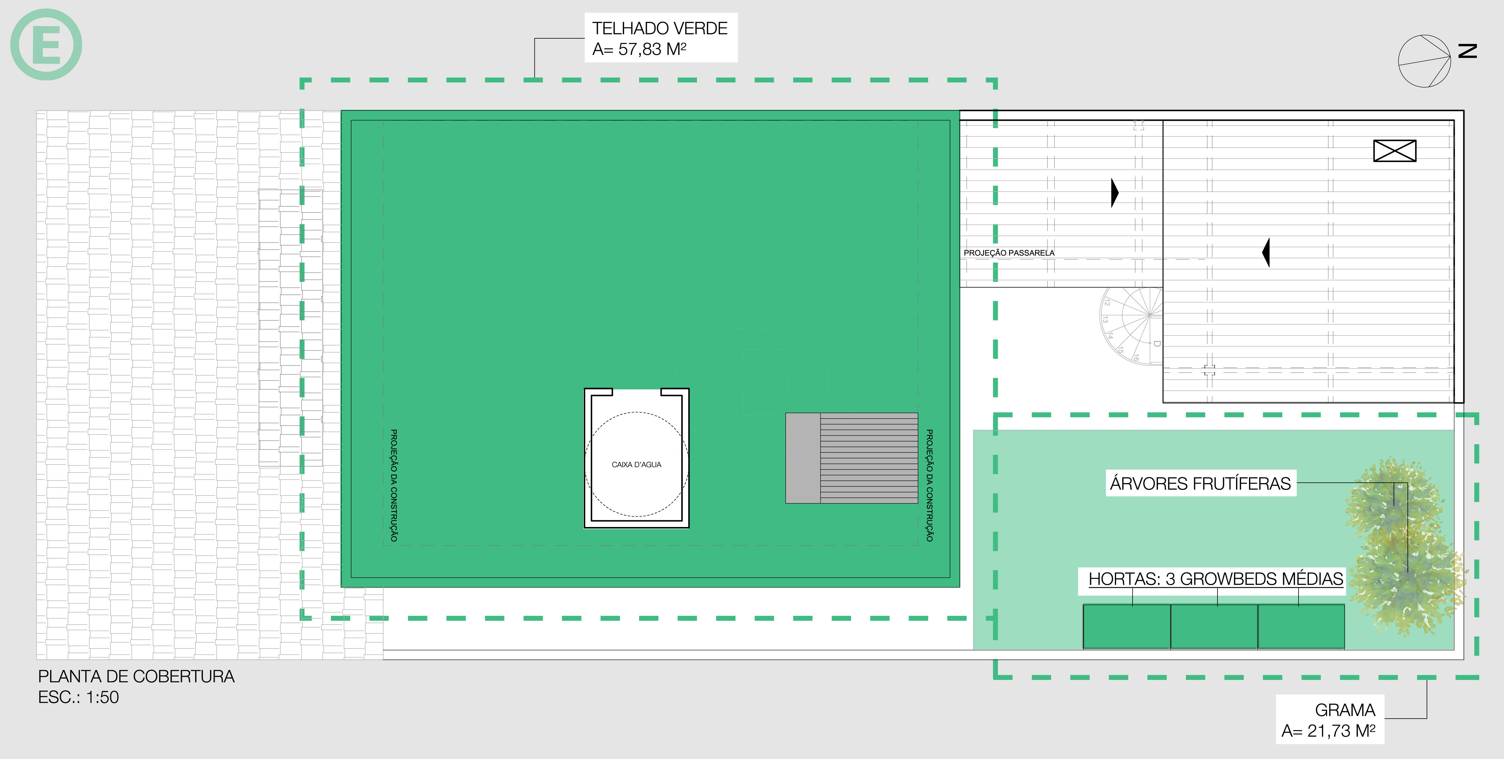 O projeto apresenta um telhado verde na cobertura que ameniza a temperatura interna neste ambiente além de melhorar a qualidade do ar.